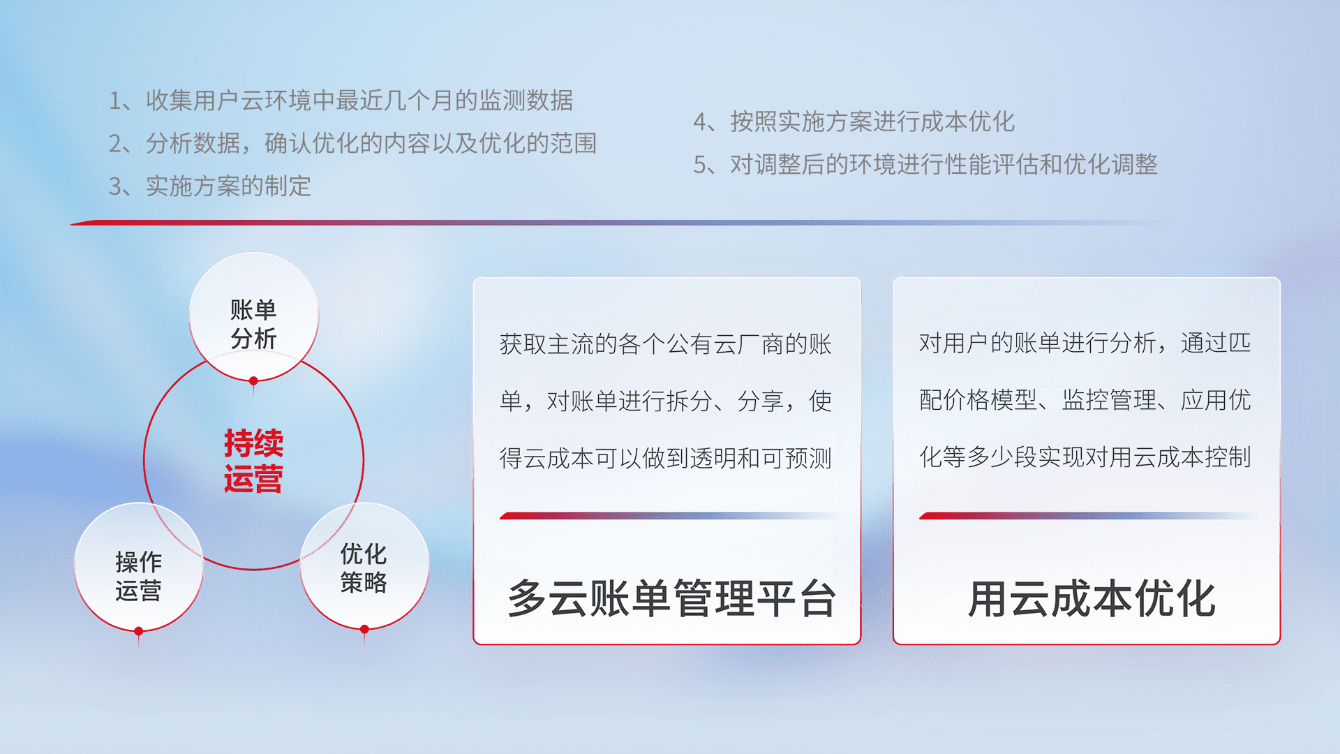 通过多云纳管,,,以统一的资源数据模型把客户的云资源进行抽象和封装,,,,进而实现对多云资源的统一操作,,保障云资源管理的可靠性、、稳定性与可用性。。量身定制化运维内容,,配置、、、、开发运维、、、、补丁管理、、、备份、、、监控、、、、认证和访问管理、、、、审计和日常巡检等,,,,保障在用云过程中的可靠度,,稳定度以及高可用率。。