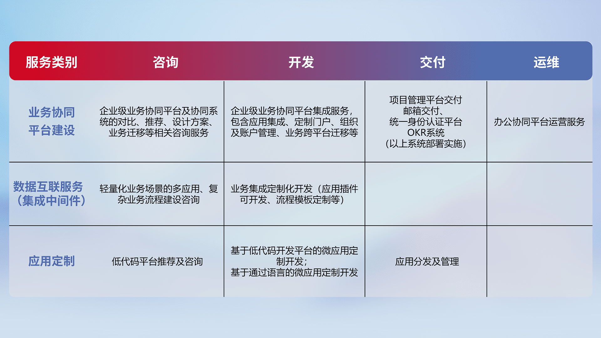 针对钉钉、、企微、、IDaas等平台级产品提供产品的规划、、、方案、、交付、、定制化开发等服务,,,实现如统一协同办公、、、智能客户服务、、、、混合会议管理、、、、智能数据查询、、等业务场景,,实现数字化转型。。。。